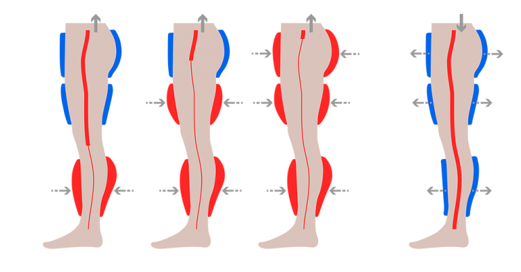 В манжеты последовательно нагнетается воздух. Процесс нагнетания происходит под определенным давлением синхронизированно с ритмом сердца. Программа подбирается индивидуально, с учетом самочувствия пациента.